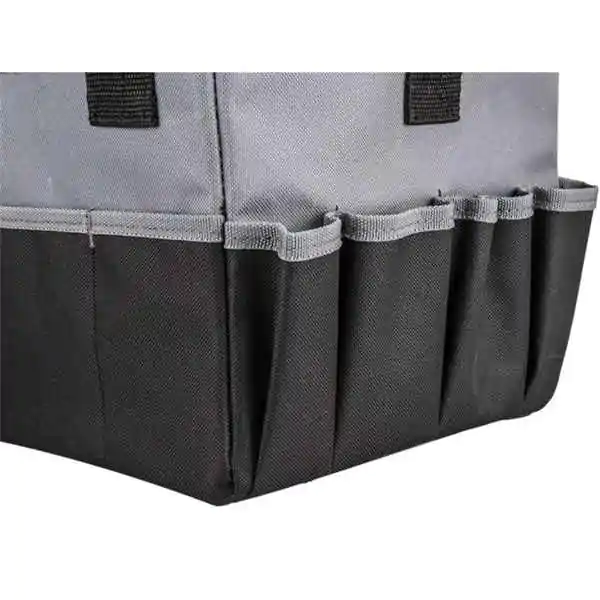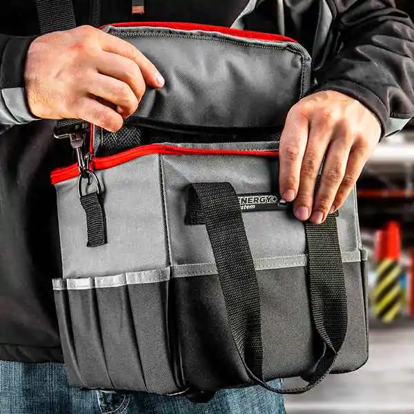• Torba raspolaže sa 14 spoljnih džepova, 3 prostrana unutrašnja džepa i 9 kukica za alat, što omogućava maksimalnu organizaciju prostora. Na metalne kuke moguće je pričvrstiti akumulatorske bušilice, merne trake i druge neophodne alate. Zahvaljujući dimenzijama od 25 × 25 × 25 cm, lako se prenosi i nudi dovoljno prostora za dva električna alata sa baterijama, punjačem i dodatnim priborom.