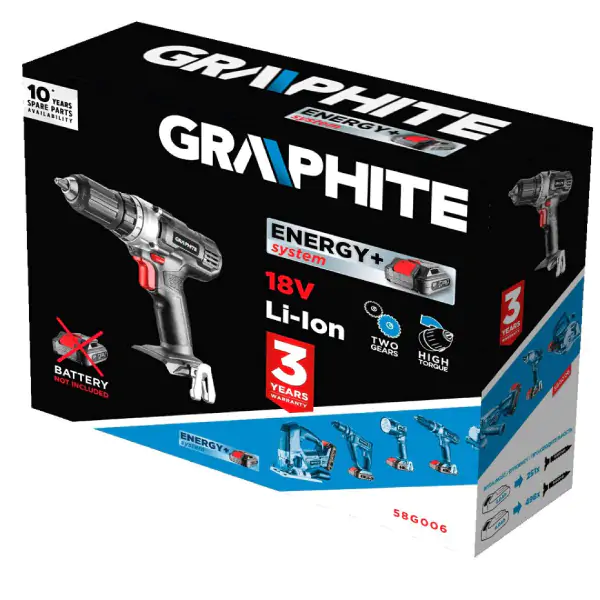 • GRAPHITE akumulatorska bušilica, kompatibilna sa 18V Li-Ion ENERGY+ sistemom, kombiniuje snagu, preciznost i izdržljivost u kompaktnom dizajnu. Dvobrzinski planetarni prenos (350 o/min za prvu i 1250 o/min za drugu brzinu) omogućava prilagodljivost različitim materijalima, dok maksimalni obrtni moment od 35 Nm (meko) / 55 Nm (tvrdo) i 19-stepeno kvačilo sa opcijom bušenja garantuju potpunu kontrolu prilikom uvrtanja. Stezna glava bez ključa prihvata pribor prečnika 2–13 mm, a električna kočnica motora i automatska blokada vretena povećavaju bezbednost i efikasnost. Integrisano LED svetlo automatski osvetljava radnu zonu, dok ergonomski oblikovana, protivklizna drška obezbeđuje udoban i siguran hvat. Sa čeličnim planetarnim zupčanicima i kompaktnom konstrukcijom, ova bušilica je pouzdan partner za sve vrste ugradbenih i "uradi sam" projekata. Isporuka je bez baterije i punjača.