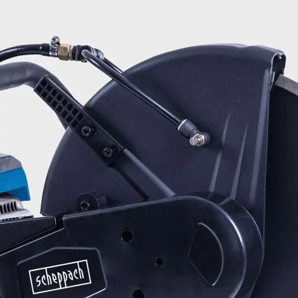 • Velika prednost modela Scheppach PTS400 je mogućnost mokrog sečenja. Integrisani priključak za baštensko crevo, uz ventil za podešavanje pritiska vode, omogućava kontrolisano hlađenje diska i smanjenje prašine tokom rada. Ovo ne samo da poboljšava kvalitet reza, već i produžava vek trajanja alata i diska.