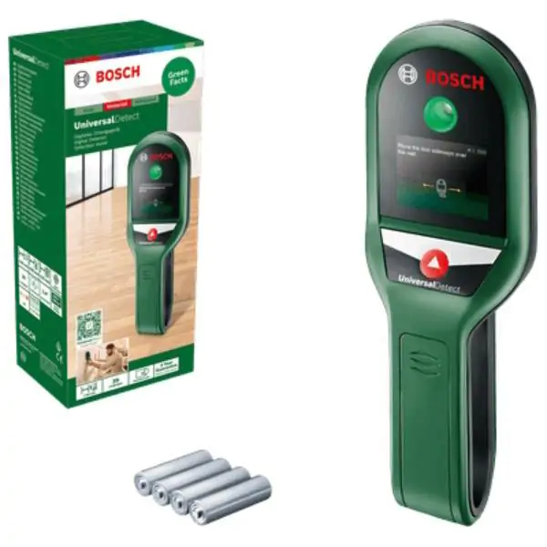 • UniversalDetect omogućava sigurnije bušenje zahvaljujući dubokom skeniranju do 10 cm u zidovima, suvoj gradnji, plafonima i podovima, locirajući metalne predmete, monofazne kablove pod naponom i drvene podstrukture. Alat ne zahteva ručnu kalibraciju – jednostavno se uključuje i odmah može da se koristi, dok animacije na ekranu pružaju intuitivna uputstva korak po korak. LED semafor i opcioni zvučni signal jasno pokazuju lokaciju detektovanog predmeta, dok otvor na sredini alata omogućava precizno označavanje mesta za bušenje ili ugradnju. UniversalDetect je jednostavan za korišćenje i idealan za sigurno kačenje slika, ugradnju svetala i druge poslove koji zahtevaju precizno bušenje i detekciju skrivenih objekata