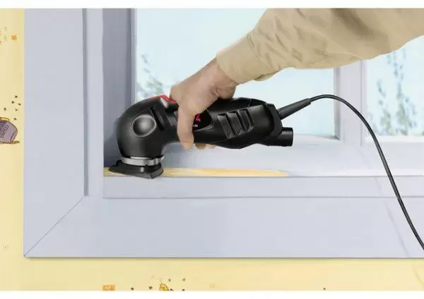 • Ergonomski dizajn ima minimalizovani prečnik alata u zoni drške, čineći ga udobnijim za držanje tokom posla brušenja. Prekidač za uključivanje/isključivanje nalazi se na vrhu alata tako da ga lako mogu koristiti i levoruki i desnoruki korisnici. Ova delta brusilica je opremljena adapterom za usisivač i tri brusna lista.
