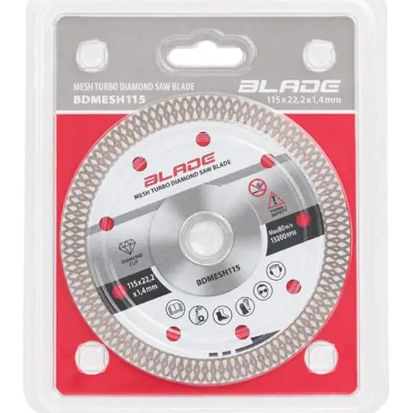 • Uvereni u profesionalne performanse i tanak, precizan rez, BLADE BDMESH115 turbo dijamantski disk predstavlja vrhunsko rešenje za sve zahtevne radove sečenja tvrdih keramičkih i kamenih materijala. Prečnika 115 mm i debljine svega 1,4 mm, sa otvorom od 22,2 mm, kompatibilan je sa većinom ugaonih brusilica i obezbeđuje izuzetno tanak rez uz minimalan otpad materijala. Zahvaljujući vruće presovanoj sinterovanoj tehnologiji sa turbo profilom i prorezima, ovaj disk garantuje visoku produktivnost, brzo hlađenje i dugotrajan radni vek čak i pri intenzivnoj upotrebi. Namenjen je za mokro i suvo sečenje pločica, tvrde keramike, porcelana, cigle, kamena, granita i mermera. Telo diska izrađeno je od čelika 65Mn, dok glava rezača sadrži vrhunske dijamante i legure u prahu. Proizveden na CNC opremi uz automatsko farbanje, dolazi u praktičnom blister pakovanju. Odlikuje ga odličan odnos cene i kvaliteta, čineći ga nezaobilaznim alatom za keramičare, gradjevinare i majstore.