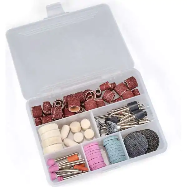 • U pakovanju se nalazi bogat set od 117 dodataka u praktičnoj kutiji, čime se omogućava širok spektar primena bez potrebe za dodatnim kupovinama. Rajber, glodalo i frezer predstavljaju sinonime za isti tip nastavka za obradu materijala i koriste se u zavisnosti od terminologije u praksi.