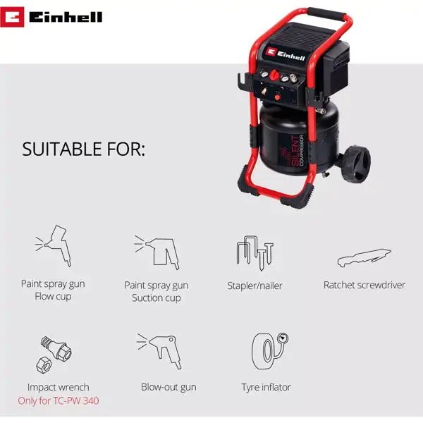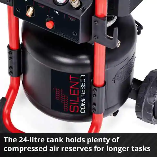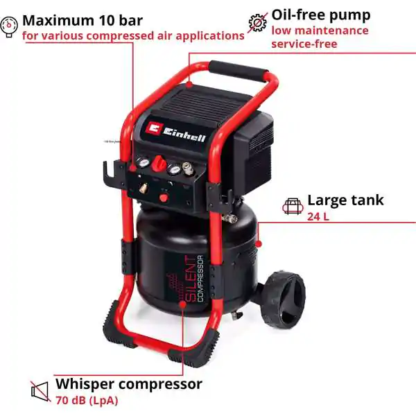 • Einhell TE-AC 240/24 Silent je napredni radionicki kompresor koji spaja visok učinak, tih rad i minimalno održavanje, što ga čini idealnim izborom za garaže, radionice i hobi majstore koji rade u zatvorenom prostoru. Sa svega 70 dB tokom rada, ovaj model spada u takozvane tihi kompresore i pruža značajno niži nivo buke u poređenju sa standardnim kompresorima slične snage.
