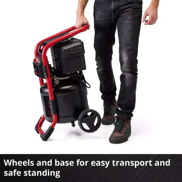 • Kompaktan uspravni dizajn omogućava jednostavno skladištenje, dok točkovi i ergonomska ručka olakšavaju transport. Rezervoar zapremine 24 litra nudi stabilan dovod vazduha, a maksimalni pritisak do 10 bar omogućava širok spektar primene, od duvanja i čišćenja do pneumatskog alata, lakših bojačkih radova i pumpanja guma.