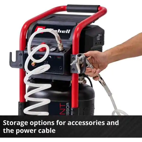 • Ulje-free pumpa potpuno eliminiše potrebu za podmazivanjem, čime se ukupni troškovi i održavanje svode na minimum. Reduktor pritiska omogućava precizno podešavanje radnog pritiska, dok su radni i bojler pritisak jasno prikazani na zasebnim manometrima. Brza spojka na izlazu omogućava lako priključivanje pneumatskog alata. Integrisani nosač kabla, gumirana odlagna površina i ventil za kondenzat olakšavaju korišćenje u svakodnevnoj upotrebi. Proizvođač obezbeđuje desetogodišnju garanciju protiv korozije rezervoara.