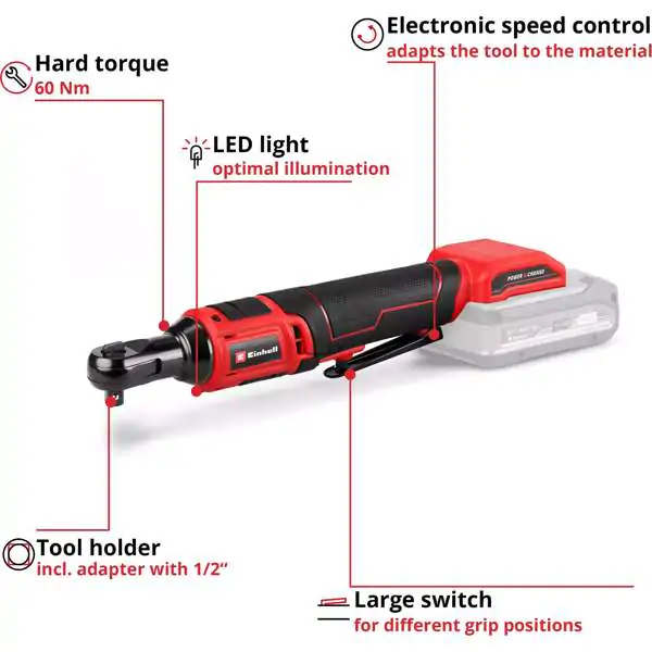 • Posebna prednost je mogućnost korišćenja alata i bez aktiviranja motora, čime se Einhell TE-RW 18/60 Li ponaša kao klasična ručna ugaona račna, ali sa opcijom brzog motornog rada kada je to potrebno. Upravo zbog toga se ovaj alat često opisuje kao kombinacija ugaonog nasadnog odvijača i ugaone račne.