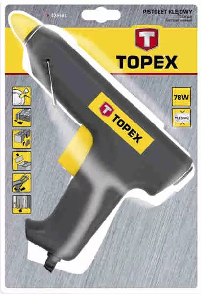 • Kompanija Topex nudi veoma povoljan i izuzetno pouzdan  pištolj za lepljenje na kojem se ogleda izbalansiranost cene i kvaliteta, preciznost i ergonomija. Električni pištolj za lepljenje možete poručiti putem interneta ili telefonom i dobičete ga u kratkom roku. Pištolj je pouzdan za laike i profesionalce jer veoma lako nanosi lepak u tečnom stanju iako se u njega stavljaju patrone čvrstog agregatnog stanja. Precizan pištolj odličnih karakteristika možete poručiti već danas.