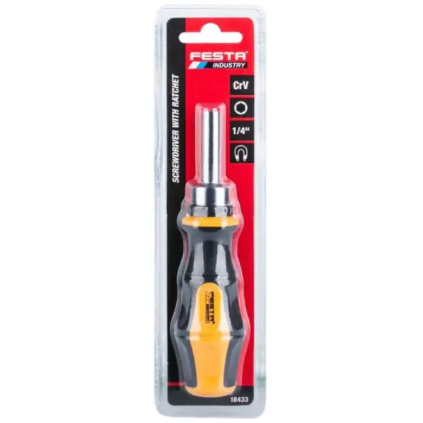 • FESTA čegrtaljka odvijač za bitove 1/4" je praktičan i izdržljiv alat namenjen preciznom zavrtanju i odvrtanju šrafova. Opremljen je mehanizmom sa čegrtaljkom (ratchet) koji omogućava brzo i efikasno okretanje bez potrebe za stalnim ponovnim pozicioniranjem odvijača.