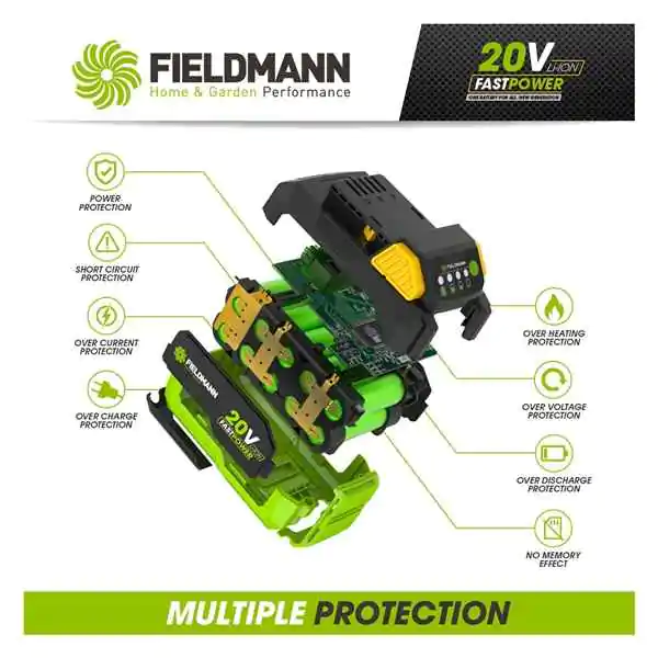 • LED indikator napunjenosti omogućava brzu proveru statusa baterije u svakom trenutku, dok ugrađena zaštita od pregrevanja, preopterećenja i prekomernog pražnjenja garantuje sigurnost i dugotrajnost. Fieldmann baterije su pouzdan izbor za sve koji koriste akumulatorski alat i žele maksimalnu efikasnost i mobilnost bez ograničenja kablovima.