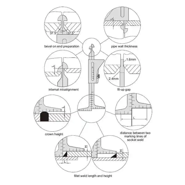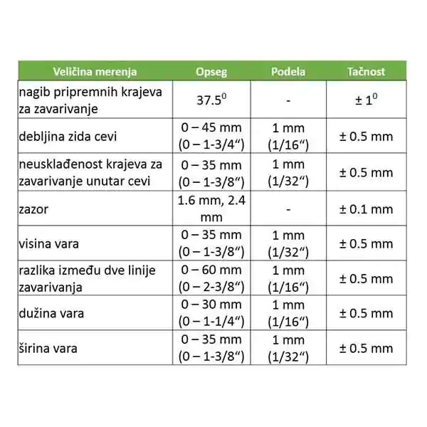 • Ovim merilom moguće je proveriti nagib pripremnih krajeva cevi za zavarivanje (37,5°), debljinu zida cevi, unutrašnju neusklađenost krajeva, zazor, visinu, širinu i dužinu vara, kao i razliku između dve linije zavarivanja.