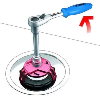 • alat ima 3 pokretna kraka, koji čvrsto prihvataju poklopac rezervoara. Kako je prilaz poklopcu obično nedostupan, ključ je konstruisan tako da zahteva minimalni prostor. Jednostavnim postavljanjem ključa na čep i okretanjem u željenom smeru vrši se skidanje poklopca. Alat se podešava prema poklopcu i poklopac se skida veoma brzo i jednostavno. Ovaj alat osigurava bezbedan rad i dugotrajnost.
