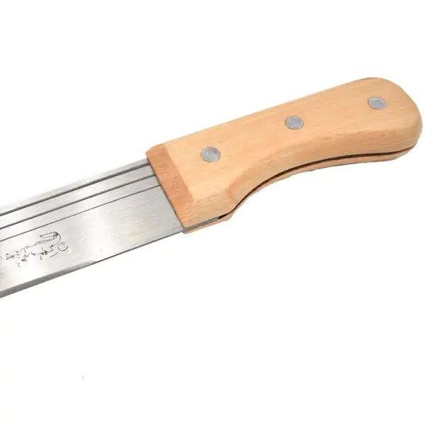 • Na obe strane sečiva nalaze tri karakteristična žleba, koji omogućavaju lakše izvlačenje iz materijala prilikom rada u gustoj vegetaciji. Drška je izrađena od nemačkog bukovog drveta, poprečno sečenog radi maksimalne stabilnosti i otpornosti. Povezana je sa sečivom pomoću čeličnih nitni i podloški, što garantuje sigurnost i trajnost čak i pri dugotrajnoj upotrebi.