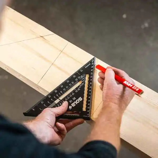 • SOLA krovni uglomeri imaju metričke skale sa obe strane (izražene u mm i cm) koje omogućavaju brzo i tačno merenje. Pomerena skala ispod T-ivice omogućava precizno obeležavanje duž ivice, dok oznake u intervalima od 0,5 cm omogućavaju jednostavno iscrtavanje paralelnih linija pomoću olovke