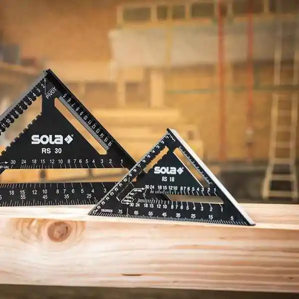 • Krovni uglomeri SOLA RS 18 i RS 30 predstavljaju profesionalne alate namenjene preciznom obeležavanju i merenju uglova pri izradi i montaži krovnih konstrukcija. Ovi modeli, dužine ivica 18 cm i 30 cm, izrađeni su u obliku jednakokrakog pravouglog trougla sa T-ivicom na jednoj strani, čime kombinuju funkcije lenjira, ugaonika, merača uglova i merača rogova u jednom alatu.