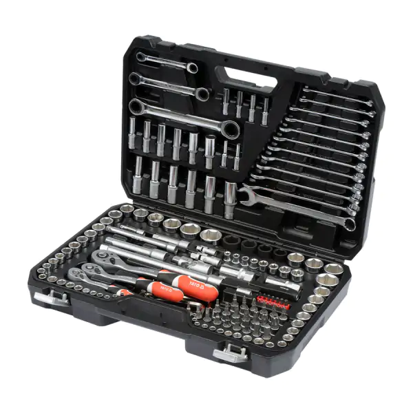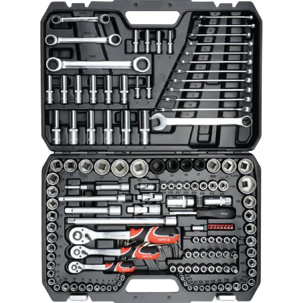 • Profesionalni set alata YATO, zasnovan na tri kĺjučna pogona (1/4", 3/8" i 1/2"), predstavlja vrhunsku alatkicu dizajniranu da odgovori na najzahtevnije izazove u auto-servisima, industriji i za napredne potrebe u domaćinstvu. Kvalitet i izdržljivost su osnova, postignuta upotrebom visokolegiranog hrom-vanadijumskog (CrV) i hrom-molibden (CrMo) čelika za nasadne ključeve i pogone, koji su kovani u matrici i termički obrađeni za maksimalnu čvrstoću i otpornost na habanje. Ključna tehnološka prednost je AS-Drive sistem koji povećava efikasnost prenosa obrtnog momenta za 25% uz istovremenu zaštitu ivica matice od oštećenja. Za kritične nastavke korišćen je izuzetno tvrdi S2 čelik, garantujući pouzdanost pod najvećim opterećenjem. Račne sa 72 zuba omogućavaju precizan rad sa minimalnim hodom od samo 5 stepeni u ograničenim radnim prostorima. Ovaj sveobuhvatni set obuhvata potpuni asortiman metričkih i inčnih nasadnih ključeva, Torx nastavaka, adaptera, produžetaka, kardanskih zglobova, kao i nezaobilaznih pomoćnih alata poput odvijača i ključeva za specijalne primene, sve organizovano u robustan kofer. YATO set je krajnji izbor za profesionalce i entuzijaste kojima su potrebna potpunost, nekompromisni kvalitet i spremnost za svaki mehanički izazov.