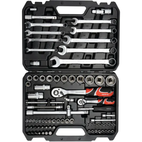 • Kvalitet i dugovečnost su osnova: nasadni ključevi, pogoni i kritični nastavci izrađeni su od visokokvalitetnih legura poput hrom-vanadijumskog (CrV 50BV30, 6150) i hrom-molibden (CrMo SCM-440) čelika, garantujući izuzetnu čvrstoću i otpornost na habanje, dok su bitovi od tvrdog S2 čelika. Račne sa 72 zuba, obogaćene AS-Drive profilom, omogućavaju precizan rad sa minimalnim hodom u ograničenim prostorima. Set je pažljivo osmišljen i uključuje bogat asortiman: kompletan raspon metričkih nasadnih ključeva, račne, adaptere, produžetke, odvijače, ključeve za svećice i druge nezaobilazne pomoćne alate. YATO set YT-12691 je idealan izbor za one kojima je potrebna ravnoteža između opsežnosti, vrhunskog kvaliteta i praktične organizacije u svakodnevnom radu.
